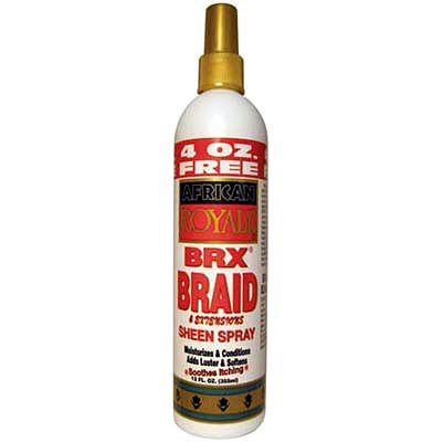 African Royale BRX Braid and Extensions Sheen Spray soothes the itching often associated with braids, weaves, and extensions. BRX is great for any commercial, synthetic, or natural hair. The 14 natural herbs and other conditioners keep hair looking good and healthy. The light formula easily penetrates through braided or weaved hair to condition deep down and keep the sheen and softness in natural or synthetic hair. BRX Contains No Alcohol or Oils that will affect bonded hair. Directions: Spray a light mist of BRX on hair and scalp. Gently massage into hair by gently pressing on hair. Mist will penetrate hair and deep condition. Use African Royale Soft As Me Shampoo and Diamond Drops for super sheen that lasts all day.