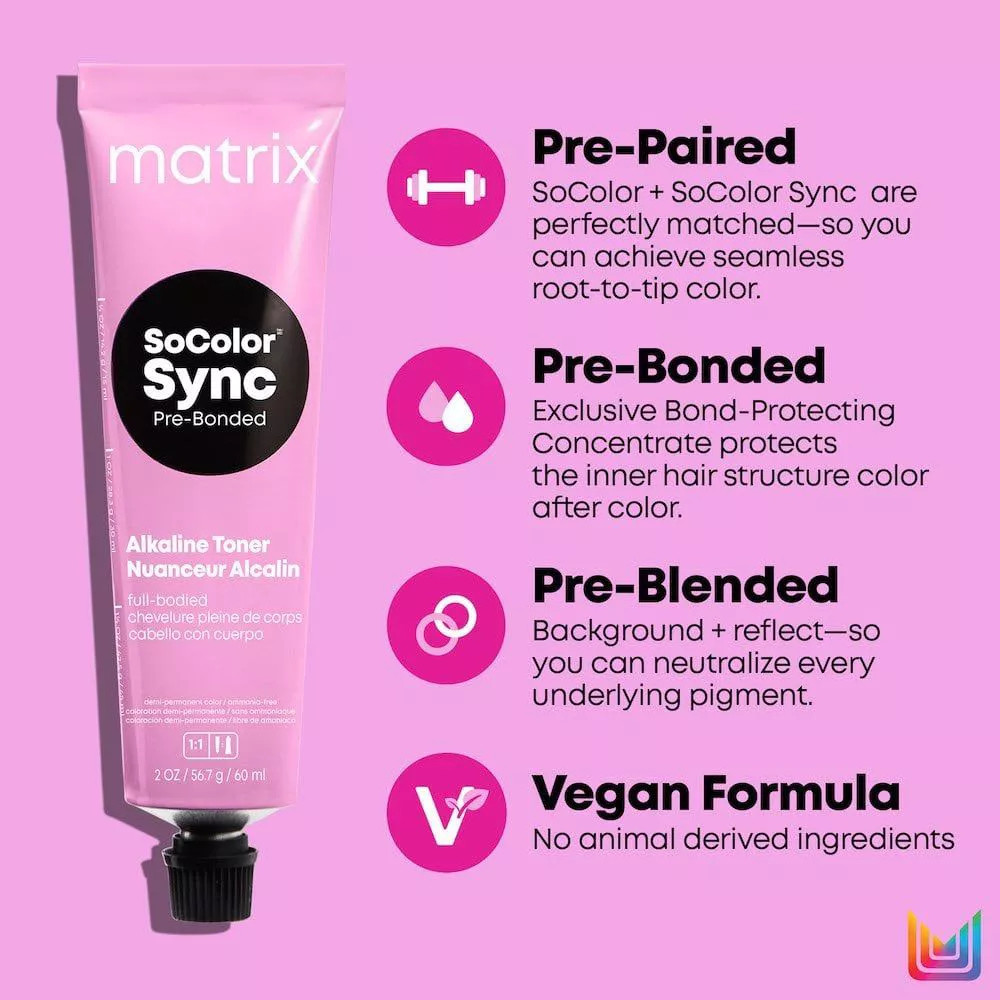 Matrix Super Sync is the ultimate multi-tasking alkaline demi-permanent hair color—now with a bond-protecting upgrade! Enjoy the same SoColor Sync results you know and love, with a formula that delivers even more protection, shine, and coverage.
